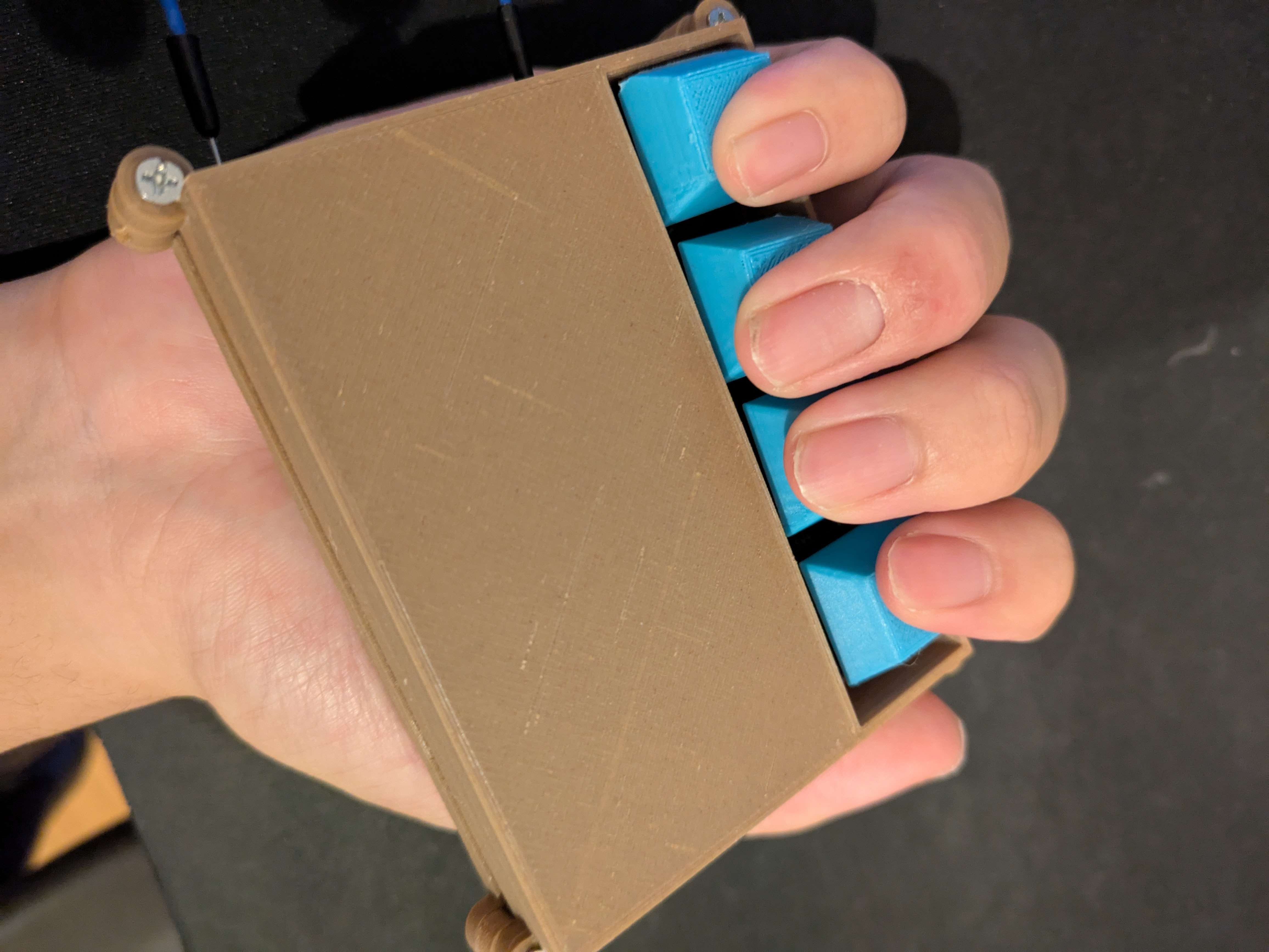 このキーボードにはそれぞれW,A,S,Dが割り当てられているので、画像のように持って指を曲げたり伸ばしたりすれば、パソコン上でモーションキャプチャーできるという訳なのです。